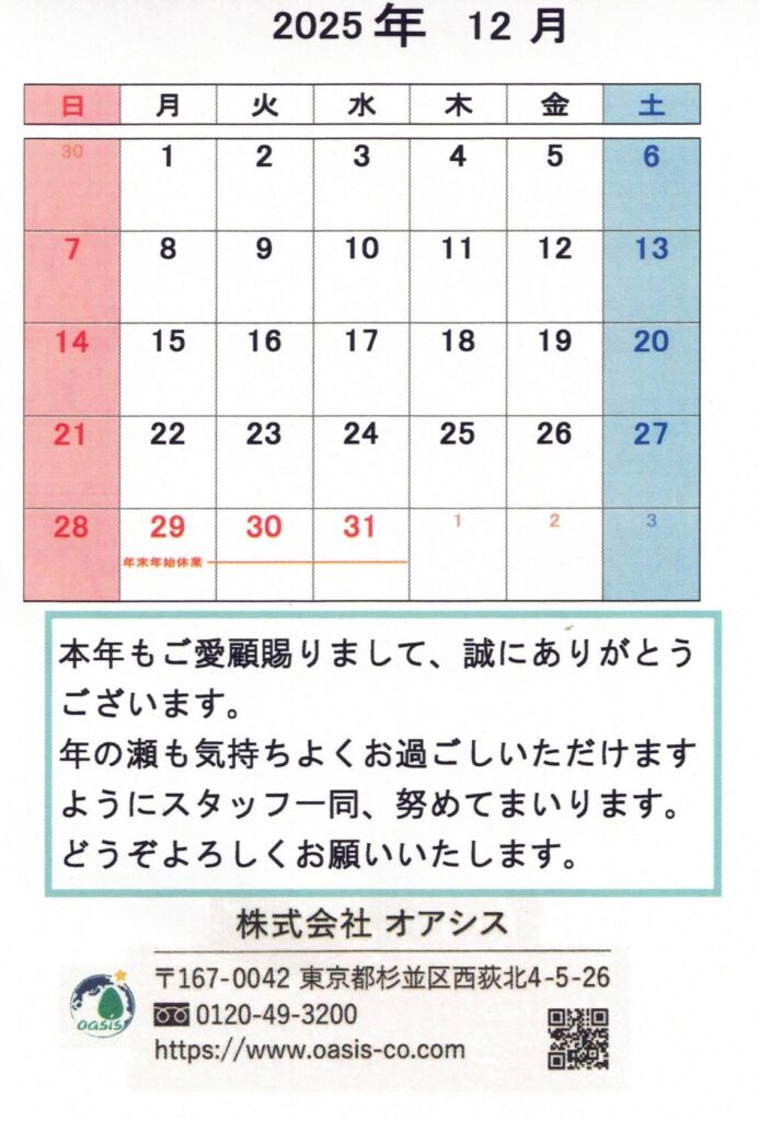 12月のスケジュール葉書 投稿者:oasis 2025年12月2日2025年12月2日 本年もご愛顧賜りまして、誠にありがとうございます。年の瀬も気持ちよくお過ごしいただけますようにスタッフ一同、努めてまいります。どうぞよろしくお願いいたします。上記内容のお葉書をお伺いするお客様にお渡しをしています。